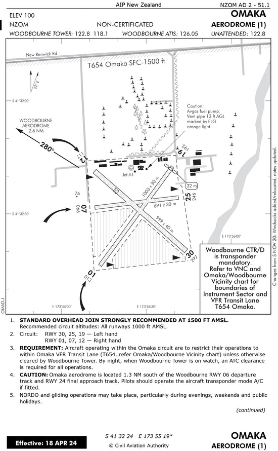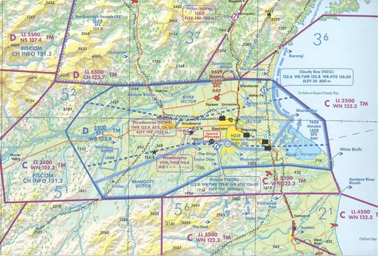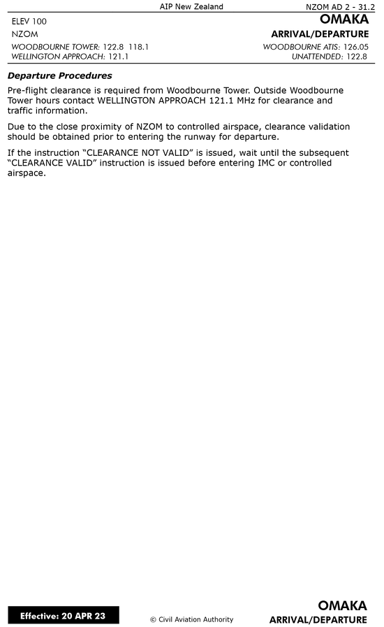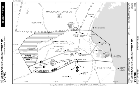 If joining from the West descend to 2500ft or below and call Woodbourne Tower on 122.80 at Wairau Valley Township and request a Rivers Arrival (see Omaka Landing Plates below). Acquire the Woodbourne ATIS on 126.05 prior to requesting clearance.