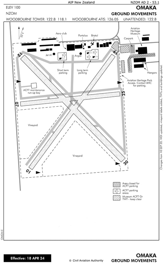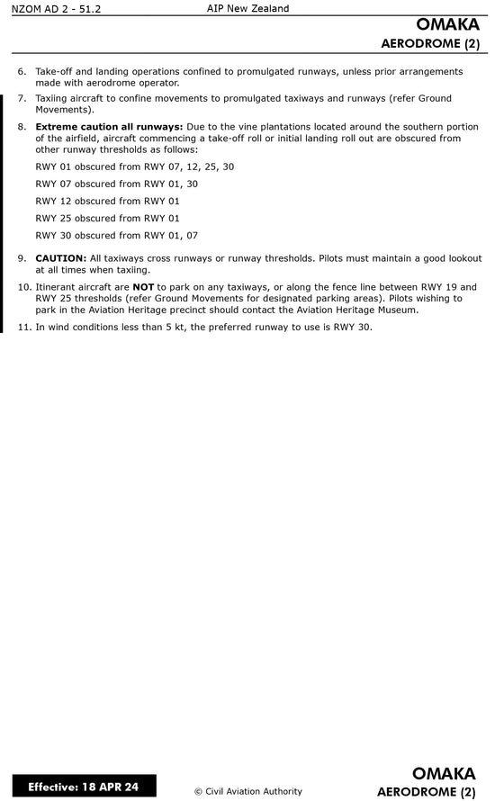 Omaka aerodrome has a large porpotion of its southern land area covered with mature vines. The height of these vines can obscure low profile aircraft either departing off, or completeing a landing roll on the initial portion of some runways, to other aircraft which may be using a different runway for departure as follows: